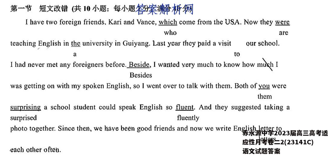 第一节短文改错(共10小题;每小题1分,满分10分)I have two foreign friends,Kari and Vance,which come from the USA.Now they werewhoareteaching English in the university in Guiyang.Last year they paid a visitour school.atoI had never met any foreigners before.Beside,I wanted very much to know how mh IBesideswas getting on with my spoken English,so I went over to talk with them.Both of you werethemsurprising a school student could speak English so fluent.And they suggested taking asurprisedfluentlyphoto together.Since then,we haye been good friends and now we write English letter toletterseach other often.