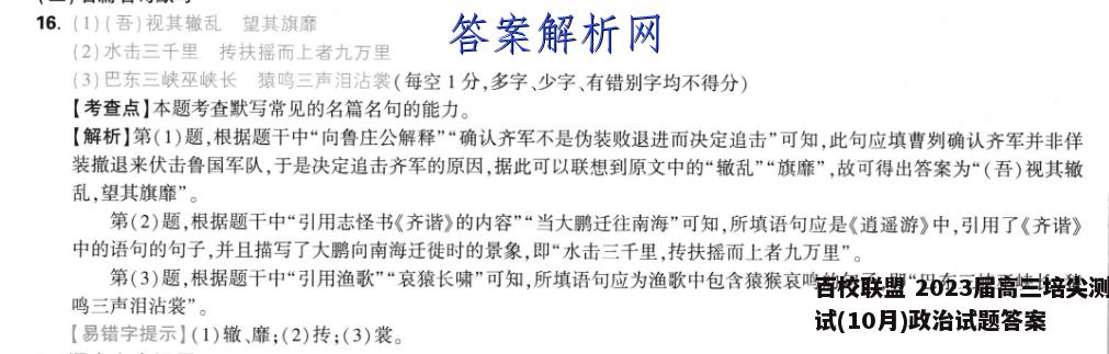 16.(1)(吾)视其辙乱望其旗靡(2)水击三千里抟扶摇而上者九万里(3)巴东三峡巫峡长猿鸣三声泪沾装(每空1分,多字、少字、有错别字均不得分)【考查点】本题考查默写常见的名篇名句的能力。【解析】第(1)题,根据题干中“向鲁庄公解释”“确认齐军不是伪装败退进而决定追击”可知,此句应填曹刿确认齐军并非佯装撤退来伏击鲁国军队,于是决定追击齐军的原因,据此可以联想到原文中的“辙乱”“旗靡”,故可得出答案为“(吾)视其辙乱,望其旗靡”。第(2)题,根据题干中“引用志怪书《齐谐》的内容”“当大鹏迁往南海”可知,所填语句应是《逍遥游》中,引用了《齐谐》中的语句的句子,并且描写了大鹏向南海迁徙时的景象,即“水击三千里,抟扶摇而上者九万里”。第(3)题,根据题干中“引用渔歌”“哀猿长啸”可知,所填语句应为渔歌中包含猿猴哀鸣的句子,即“巴东三峡巫峡长,猿鸣三声泪沾裳”。【易错字提示】(1)辙、靡;(2)抟;(3)裳。