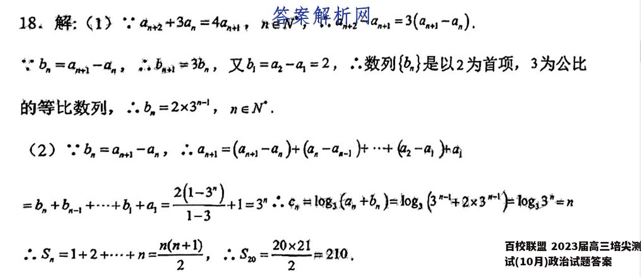 18。解:(1)a2+3an=4aH,n∈W,,a2-a1=3(a-a).b,=a1-an,.b=b,又6=42-4=2,数列{b}是以2为首项,3为公比的等比数列,.bn=2×3-,neN.(2).bn=a1-an,∴.a1=(a*1-an)】+(an-a-1H…+-4ha=b+6+…+6+4=-)+1=36,=1oga,+6,)=o8,B2x3rog3*=n1-3“=1+2++n=m0+9,30=202L=210.22