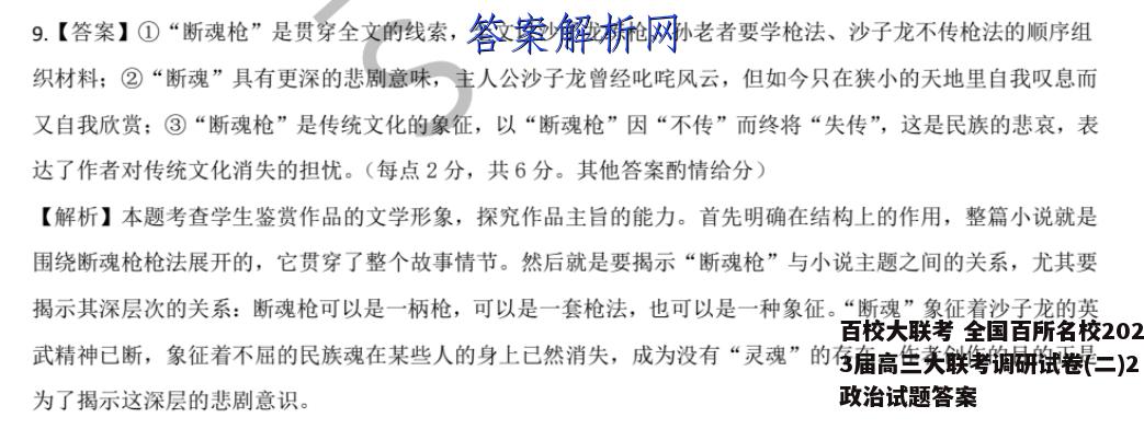 7.【答案】D【解析】本题考查学生对文本艺术特色的分析鉴赏能力。D项,“揭示了国民灵魂的麻木与冷酷”有过度解读之嫌,这里主要是为了烘托沙子龙的形象特点的,王三胜和小顺们则是作为次要人物,以便于突显主人公沙子龙的性格特征。A项,小说开篇交代这一事实,尤其是“镖局”“客栈”这两个物象,能使读者很容易想到见过的武侠影视,呈现强烈的视觉冲击力,并由此产生一探究竟的期待。分析正确。B项,小说第五段主要是回顾沙子龙辉煌的历史,但前后的内容已经表明当年的威名和高超的武艺都己经成为历史了,他将“镖局”改换成“客栈”以及不愿谈武艺和过往就足以表明他当前的现状。分析正确。C项,孙老者要学艺,沙子龙借故推脱,二人对话十分干脆利落,但却突显出二人不同的性格特征,一急一缓,一个崭露头角一个极其精明。作者对他们的褒贬结合全文内容可以知晓,扬孙抑沙。8.【答案】①在人物形象方面,沙子龙常关起门来一个人独自练习枪法这一行为,表明他对昔日在江湖中红极一时的枪法和名声的深深怀念,丰富了人物的性格和形象。②在情节结构方面,使前后照应,行文更加紧凑。③在思想主题方面,与他一而再、再而三拒绝向孙老者传授枪法的行为形成对比与反差,令人深思,深化小说的主题。(每点2分,共6分,其他答案酌情给分)【解析】本题考查学生分析鉴赏作品写作手法的能力。考生首先要准确找出对两次练枪的描写,然后分析沙子龙练枪的背景是什么,当时的心理如何。再分析这两次练枪之间的关系以及产生的表达效果。9.【答案】①“断魂枪”是贯穿全文的线索,全文以沙子龙练枪、孙老者要学枪法、沙子龙不传枪法的顺序组织材料:②“断魂”具有更深的悲剧意味,主人公沙子龙曾经叱咤风云,但如今只在狭小的天地里自我叹息而又自我欣赏:③“断魂枪”是传统文化的象征,以“断魂枪”因“不传”而终将“失传”,这是民族的悲哀,表达了作者对传统文化消失的担忧。(每点2分,共6分。其他答案酌情给分)【解析】本题考查学生鉴赏作品的文学形象,探究作品主旨的能力。首先明确在结构上的作用,整篇小说就是围绕断魂枪枪法展开的,它贯穿了整个故事情节。然后就是要揭示“断魂枪”与小说主题之间的关系,尤其要揭示其深层次的关系:断魂枪可以是一柄枪,可以是一套枪法,也可以是一种象征。“断魂”象征着沙子龙的英武精神己断,象征着不屈的民族魂在某些人的身上己然消失,成为没有“灵魂”的存在。作者创作的目的正是为了揭示这深层的悲剧意识。