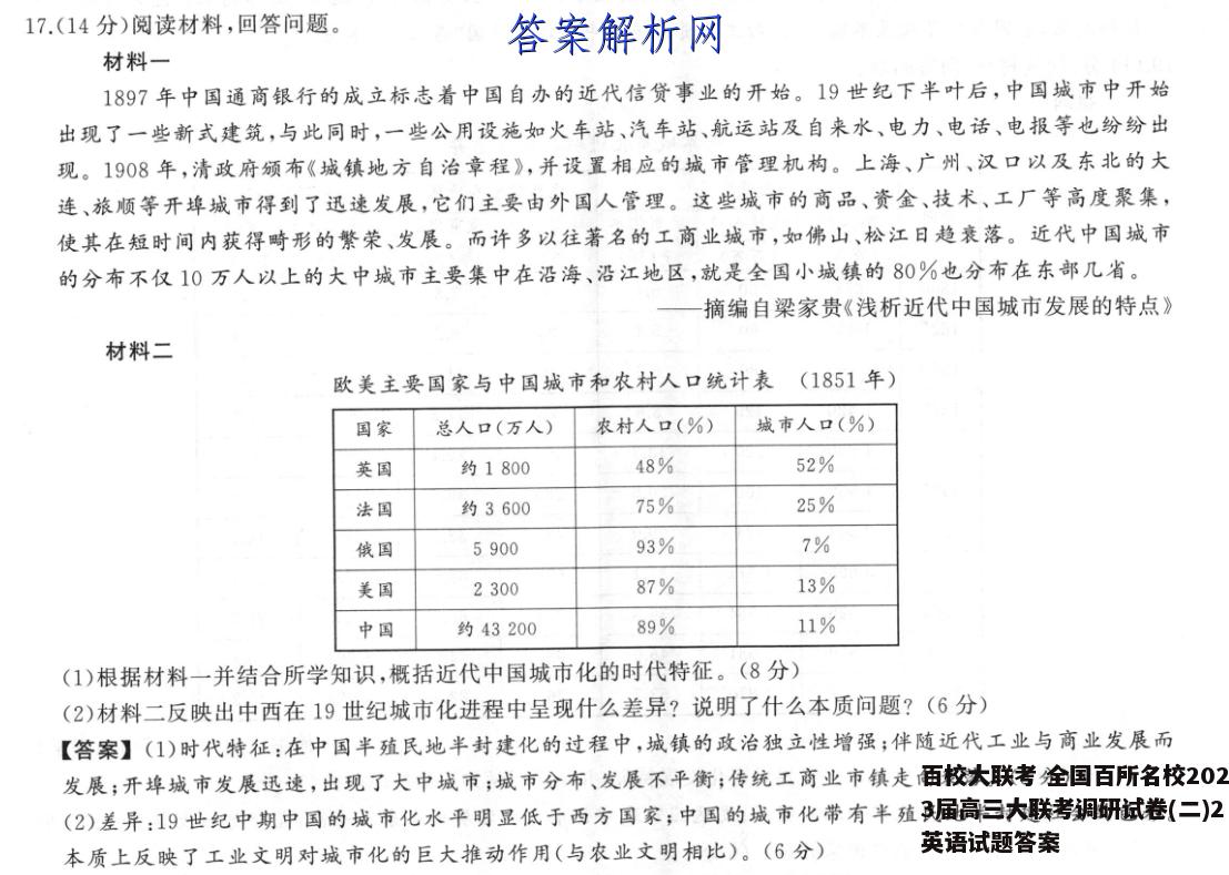 17.(14分)阅读材料,回答问题。材料一1897年中国通商银行的成立标志着中国自办的近代信贷事业的开始。19世纪下半叶后,中国城市中开始出现了一些新式建筑,与此同时,一些公用设施如火车站、汽车站、航运站及自来水、电力、电话、电报等也纷纷出现。1908年,清政府颁布《城镇地方自治章程》,并设置相应的城市管理机构。上海、广州、汉口以及东北的大连、旅顺等开埠城市得到了迅速发展,它们主要由外国人管理。这些城市的商品、资金、技术、工厂等高度聚集,使其在短时间内获得畸形的繁荣、发展。而许多以往著名的工商业城市,如佛山、松江日趋衰落。近代中国城市的分布不仅10万人以上的大中城市主要集中在沿海、沿江地区,就是全国小城镇的80%也分布在东部几省。摘编自梁家贵《浅析近代中国城市发展的特点》材料二欧美主要国家与中国城市和农村人口统计表(1851年)国家总人口(万人)农村人口(%)城市人口(%)英国约180048%52%法国约360075%25%俄国590093%7%美国230087%13%中国约4320089%11%(1)根据材料一并结合所学知识,概括近代中国城市化的时代特征。(8分)(2)材料二反映出中西在19世纪城市化进程中呈现什么差异?说明了什么本质问题?(6分)【答案】(1)时代特征:在中国半殖民地半封建化的过程中,城镇的政治独立性增强;伴随近代工业与商业发展而发展;开埠城市发展迅速,出现了大中城市;城市分布、发展不平衡;传统工商业市镇走向衰落。(8分)(2)差异:19世纪中期中国的城市化水平明显低于西方国家;中国的城市化带有半殖民地半封建社会的色彩。本质上反映了工业文明对城市化的巨大推动作用(与农业文明相比)。(6分)