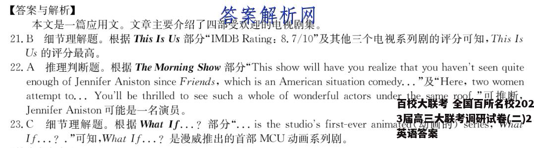 【答案与解析】本文是一篇应用文。文章主要介绍了四部受欢迎的电视剧集。21.B细节理解题。根据This Is Us部分“IMDB Rating:8.7/I0”及其他三个电视系列剧的评分可知,This IsUs的评分最高。22.A推理判断题。根据The Morning Show部分“This show will have you realize that you haven't seen quiteenough of Jennifer Aniston since Friends,which is an American situation comedy...""Here,two womenattempt to...You'll be thrilled to see such a whole of wonderful actors under the same roof.”可推断,Jennifer Aniston可能是一名演员。23.C细节理解题。根据What If..?部分“..is the studio's first--ever animated(动画的)series,WhatIf..?.”可知,What If..?是漫威推出的首部MCU动画系列剧。