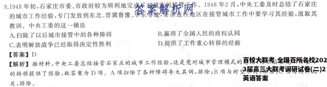 9.1948年初,石家庄市委、市政府较为顺利地完成了对城市的接管工作。1948年2月,中央工委及时总结了石家庄的城市工作经验,专门发放到东北、晋冀鲁豫、华东等地,要求这些地区在接管城市工作中要学习其经验,汲取其教训。中央工委的这一做法A.扫除了以后城市接管中的各种障碍B.赢得了全国人民的政权认同C,表明解放战争已经取得决定性胜利D.提供了工作重心转移的经验【答案】D【解析】据材料,中央工委总结接管石家庄的城市工作经验,这是党对城市管理模式的总结,为以后全党工作重心的转移提供了经验,故答案为D项。A项扫除了各种障碍夸大其词,排除;B项与时空不符,排除;C项与材料无关,排除。