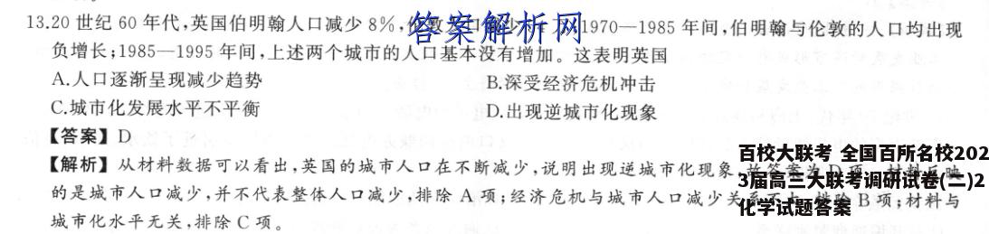 13.20世纪60年代,英国伯明翰人口减少8%,伦敦人口减少54万;1970一1985年间,伯明翰与伦敦的人口均出现负增长;1985一1995年间,上述两个城市的人口基本没有增加。这表明英国A.人口逐渐呈现减少趋势B.深受经济危机冲击C.城市化发展水平不平衡D.出现逆城市化现象【答案】D【解析】从材料数据可以看出,英国的城市人口在不断减少,说明出现逆城市化现象,故答案为D项。材料反映的是城市人口减少,并不代表整体人口减少,排除A项;经济危机与城市人口减少关系不大,排除B项;材料与城市化水平无关,排除C项。