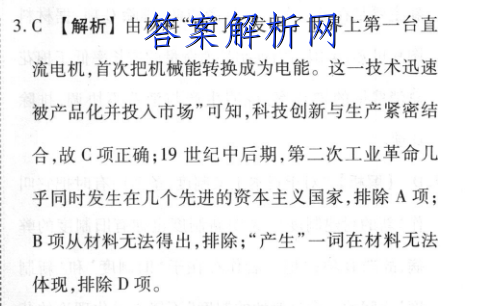 3.C【解析】由材料“西门子发明了世界上第一台直流电机,首次把机械能转换成为电能。这一技术迅速被产品化并投入市场”可知,科技创新与生产紧密结合,故C项正确:19世纪中后期,第二次工业革命几乎同时发生在几个先进的资本主义国家,排除A项;B项从材料无法得出,排除:“产生”一词在材料无法体现,排除D项。