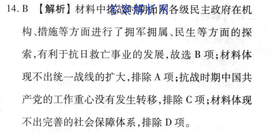 14.B【解析】材料中抗战时期山东各级民主政府在机构、措施等方面进行了拥军拥属、民生等方面的探索,有利于抗日救亡事业的发展,故选B项;材料体现不出统一战线的扩大,排除A项;抗战时期党的工作重心没有发生转移,排除C项;材料体现不出完善的社会保障体系,排除D项。