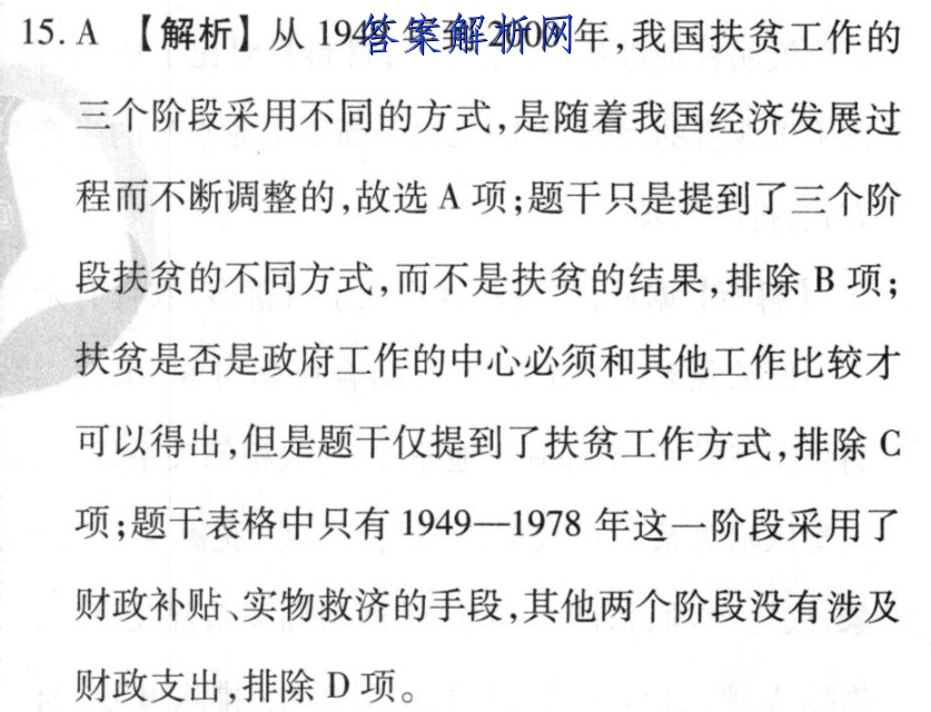 15.A【解析】从1949年到2000年,我国扶贫工作的三个阶段采用不同的方式,是随着我国经济发展过程而不断调整的,故选A项;题干只是提到了三个阶段扶贫的不同方式,而不是扶贫的结果,排除B项;扶贫是否是政府工作的中心必须和其他工作比较才可以得出,但是题干仅提到了扶贫工作方式,排除C项;题干表格中只有1949一1978年这一阶段采用了财政补贴、实物救济的手段,其他两个阶段没有涉及财政支出,排除D项。