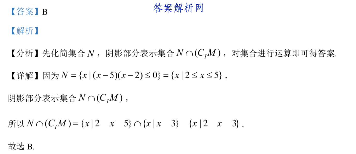 【答案】B【解析】【分析】先化简集合N,阴影部分表示集合N⌒(C,M),对集合进行运算即可得答案【详解】因为N={x|(x-5)(x-2)≤0}={x|2≤x≤5},阴影部分表示集合N∩(C,M),所以W∩(C,M)={x|2x5}∩{x|x3}{x|2x3}.故选B.【点睛】本题考查集合中韦恩图的应用,需读懂图形语言表示的集合间的基本运算,再通过准确的运算求得答案