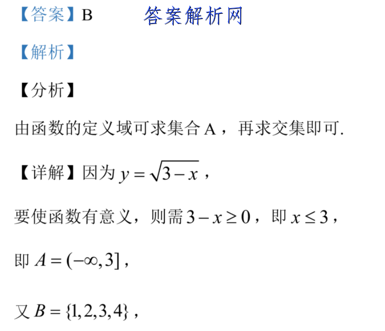 【答案】B【解析】【分析】由函数的定义域可求集合A,再求交集即可.【详解】因为y=√3-x,要使函数有意义,则需3-x≥0,即x≤3,即A=(-0,3],又B={1,2,3,4,所以A∩B={1,2,3},故选:B.