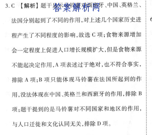 3.C【解析】题干显示马铃薯对西班牙、中国、英格兰、法国分别起到了不同的作用,对上述几个国家历史进程产生了不同程度的影响,故选C项:食物来源增加会一定程度上促进人口增长规模扩大,但是食物来源不能起决定作用,A项表述过于绝对,也不符合事实,排除A项;B项只能体现马铃薯在法国所起到的作用,没法体现在中国、英格兰和西班牙的作用,排除B项;题干提到的是马铃薯对不同国家和地区的作用,与人口迁徙和文化认同无关,排除D项。