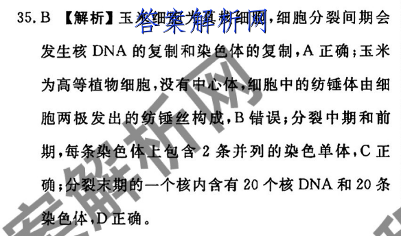 35.B【解析】玉米细胞为真核细胞,细胞分裂间期会发生核DNA的复制和染色体的复制,A正确;玉米为高等植物细胞,没有中心体,细胞中的纺锤体由细胞两极发出的纺锤丝构成,B错误;分裂中期和前期,每条染色体上包含2条并列的染色单体,C正确;分裂末期的一个核内含有20个核DNA和20尔染色体,D正确。