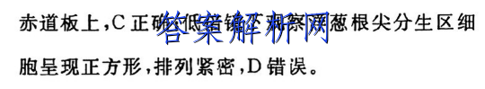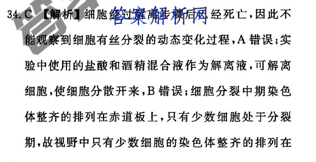 34:C〖解标细胞经过解离步骤后已经死亡,因此不能观察到细胞有丝分裂的动态变化过程,A错误:实验中使用的盐酸和酒精混合液作为解离液,可解离细胞,使细胞分散开来,B错误;细胞分裂中期染色体整齐的排列在赤道板上,只有少数细胞处于分裂期,故视野中只有少数细胞的染色体整齐的排列在赤道板上,C正确,低倍镜下观察洋葱根尖分生区细胞呈现正方形,排列紧密,D错误。