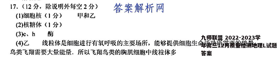 17.(12分,除说明外每空2分)(1)细胞核(1分)甲和乙(2)核榭体(1分)(3e、h的(4)乙线粒体是细胞进行有氧呼吸的主要场所,能够提供细胞生命活动所徭要的能量。鸟类飞翔需要大量能量.所以飞翔鸟类的胞肌细胞中线粒体多