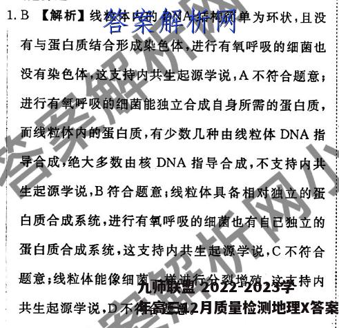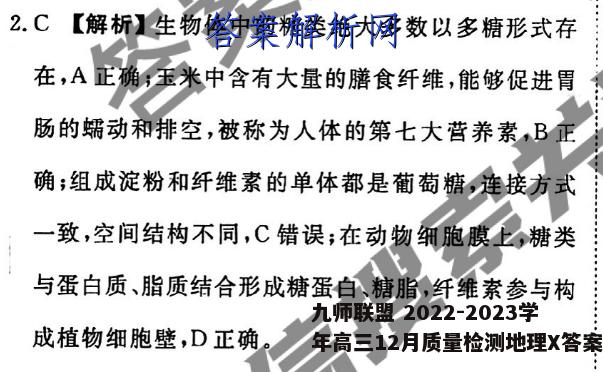 九师联盟 2022-2023学年高三12月质量检测地理X答案