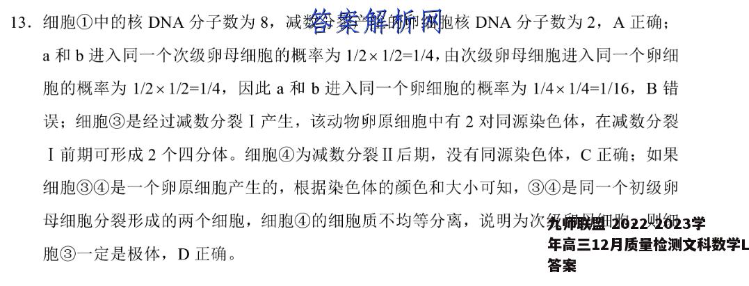 13.细胞①中的核DNA分子数为8,减数分裂产生的卵细胞核DNA分子数为2,A正确:a和b进入同一个次级卵母细胞的概率为1/2×1/2=1/4,由次级卵母细胞进入同一个卵细胞的概率为1/2×1/2=1/4,因此a和b进入同一个卵细胞的概率为1/4×1/4=1/16,B错误;细胞③是经过减数分裂I产生,该动物卵原细胞中有2对同源染色体,在减数分裂I前期可形成2个四分体。细胞④为减数分裂Ⅱ后期,没有同源染色体,C正确:如果细胞③④是一个卵原细胞产生的,根据染色体的颜色和大小可知,③④是同一个初级卵母细胞分裂形成的两个细胞,细胞④的细胞质不均等分离,说明为次级卵母细胞,则细胞③一定是极体,D正确。
