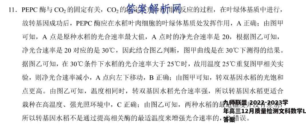 11.PEPC酶与CO2的固定有关,CO,的固定是光合作用暗反应的过程,在叶绿体基质中进行,故转基因成功后,PEPC酶应在水稻叶肉细胞的叶绿体基质处发挥作用,A正确:由图甲可知,A点是原种水稻的光合速率最大值,A点时的净光合速率是20,根据图乙可知,净光合速率是20对应的是30℃,因此结合图乙判断,图甲曲线是在30℃下测得的结果。据图乙可知,在30℃条件下水稻的光合速率大于25℃时,故用温度25℃重复图甲相关实验,则净光合速率减小,A点向左下移动,B正确;由图甲可知,转双基因水稻的光饱和点更高。由图乙可知,温度相同时,转双基因水稻光合速率强,所以转基因水稻更适合栽种在高温度、强光照环境中,C正确:由图乙可知,两种水稻的最适温度并没有差别,所以转基因水稻不是通过提高相关酶的最适温度来增强光合速率的,D错误。