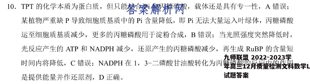 10.TPT的化学本质为蛋白质,但只能结合Pi和丙糖磷酸,载体还是具有专一性,A错误:某植物严重缺P导致细胞质基质中的P含量降低,即P无法大量运入叶绿体,丙糖磷酸运至细胞质基质减少,更多的丙糖磷酸用于淀粉合成,B错误:当光照强度突然降低时,光反应产生的ATP和NADPH减少,还原产生的丙糖磷酸减少,再生成RuBP的含量短时间内将降低,C错误;NADPH在1,3-二磷酸甘油酸转化为丙糖磷酸的反应中的作用是提供能量并作还原剂,D正确。