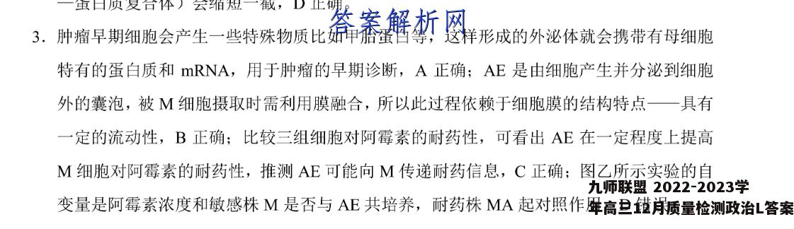 一茧口项复合小)云佰短一截,上用。3.肿瘤早期细胞会产生一些特殊物质比如甲胎蛋白等,这样形成的外泌体就会携带有母细胞特有的蛋白质和RNA,用于肿瘤的早期诊断,A正确:AE是由细胞产生并分泌到细胞外的囊泡,被M细胞摄取时需利用膜融合,所以此过程依赖于细胞膜的结构特点一具有一定的流动性,B正确:比较三组细胞对阿霉素的耐药性,可看出AE在一定程度上提高M细胞对阿霉素的耐药性,推测AE可能向M传递耐药信息,C正确:图乙所示实验的自变量是阿霉素浓度和敏感株M是否与AE共培养,耐药株MA起对照作用,D错误。