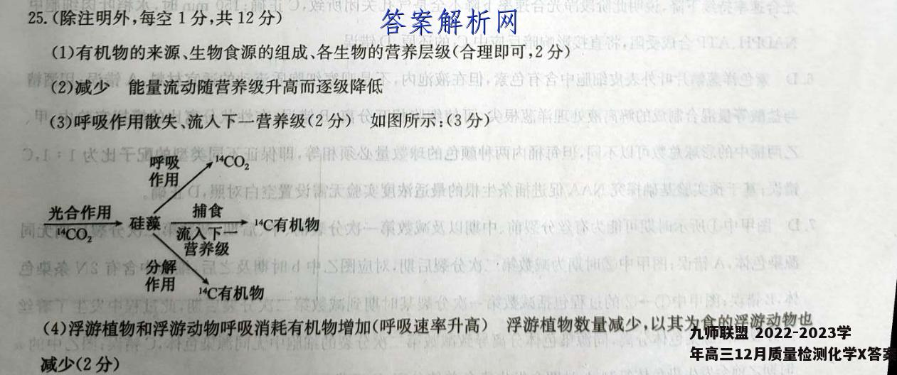 25.(除注明外,每空1分,共12分)○,年T明大木只金不科举联合代华(1)有机物的来源、生物食源的组成、各生物的营养层级(合理即可,2分)自,卖合A,9静(2)减少能量流动随营养级升高而逐级降低内年查日装心目合中表代心甲(3)呼吸作用散失,、流人下一营养级(2分)如图所示:(3分)尖鼎群高的合量节益,:「长出于呼吸类C0,州明,销尽量地狂的白脑件两内,同下心的中可S作用丁,频权白空置沃能爽组水致景的中染出AA么基:芳置光合作用捕食4C02硅藻流入下“C有机物伦水-有发德中,前代水式的破中甲图d营养级自卓乘y3赛舍分解期相d中S例边以,堪司察代为·牌处据政州⑧中甲网:是的,限感作用4C有机物(4)浮游植物和浮游动物呼吸消耗有机物增加(呼吸速率升高)浮游植物数量减少,以其为食的浮游动物也减少(2分)