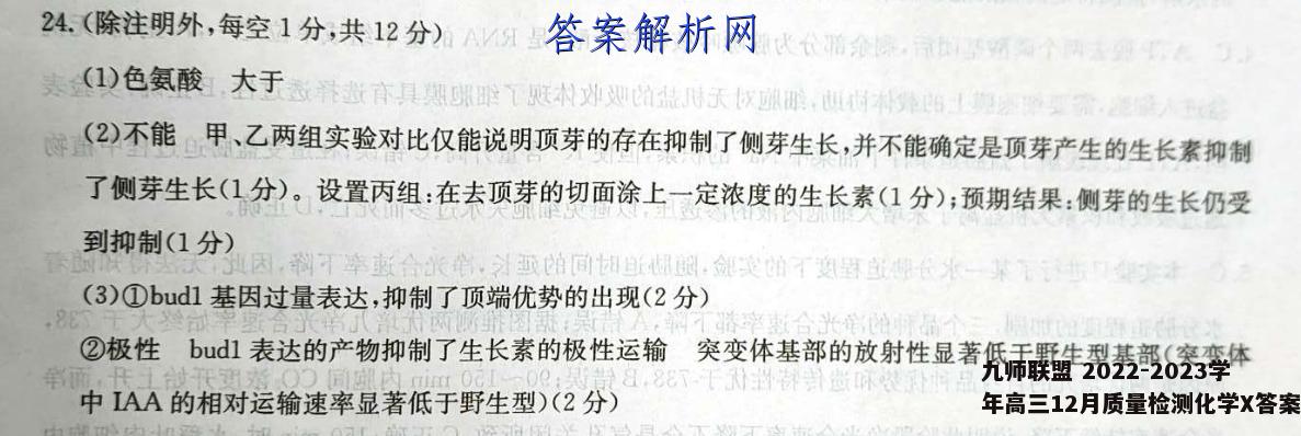 24.(除注明外,每空1分,共12分)A4牙显,娇甘别比代暗金一,个去(1)色氨酸,大于数武数有具期吸雕庭村外划陆天标咖酿,时给的如必靠,摩人心(②)不能。甲、乙两组实验对比仅能说明顶芽的存在抑制了侧芽生长,并不能确定是顶芽产生的生长素抑制了侧芽生长(1分)。设置丙组:在去顶芽的切面涂上一定浓度的生长素(1分);预期结果:侧芽的生长仍受到抑制(1分)因,张,或治同切自:团园,邻奖的不宝数硬食光一鲜出(3)①bud1基因过量表达,抑制了顶端优势的出现(2分)②极性bud1表达的产物抑制了生长素的极性运输突变体基部的放射性显著低于野生型基部(突变体中LAA的相对运输速率显著低于野生型)(2分)