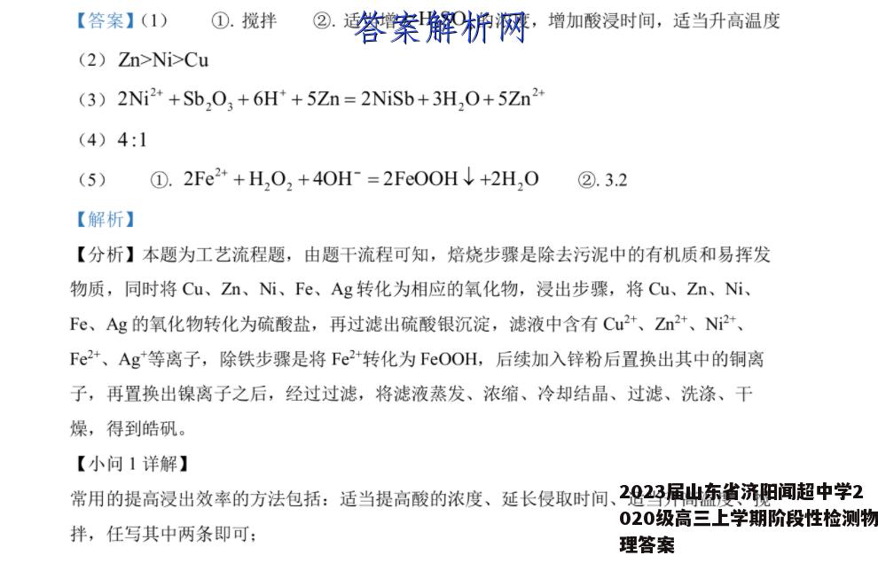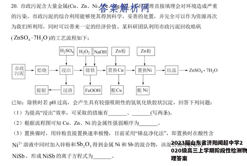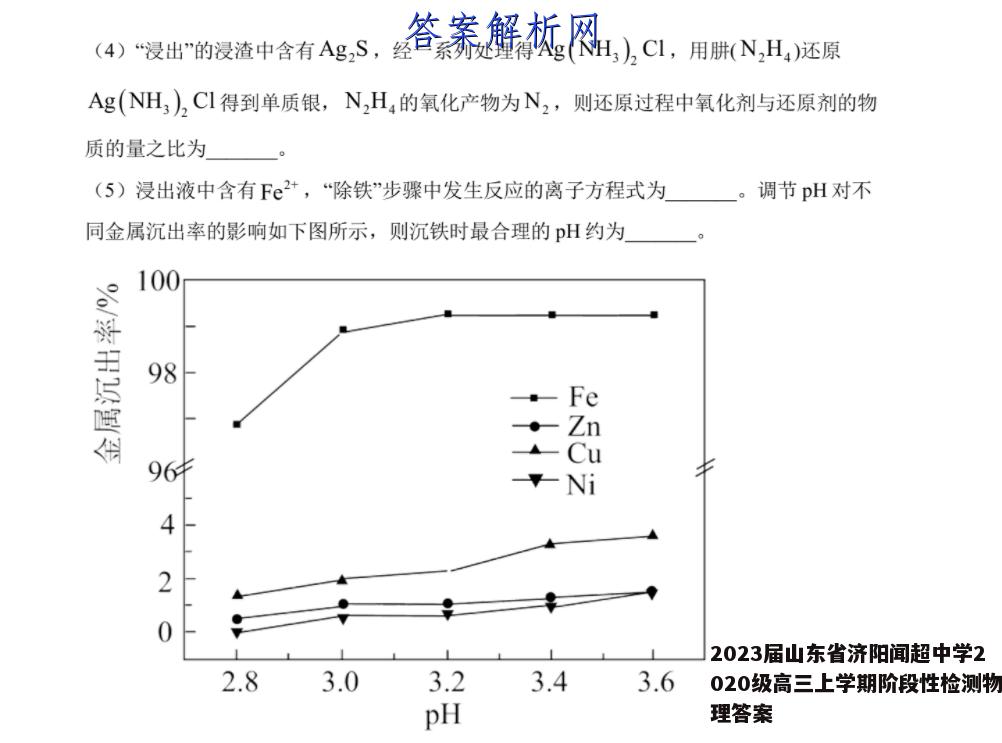 20.市政污泥含大量金属(Cu、Zn、Ni、Fe、Ag等),不经处理直接填埋会对环境造成严重的污染。市政污泥的综合利用能够使其得到科学、妥善的处置,并完全可以作为资源再次为我们所利用,同时可以带来一定的经济价值。某科研团队利用市政污泥回收皓矾(ZnSO4·7H,O)的工艺流程如下:H2S04H202NaOHZn粉Zn粉市政置换Cu污泥焙烧浸出除铁置换Ni结晶→ZnS04·7H20提银浸渣FeOOH粗Cu粗Ni已知:除铁时若H过高,会产生具有较强吸附性的氢氧化铁胶状沉淀,回答下列问题:(1)为提高浸出”效率,可采取的措施有(写两条)。(2)根据流程图可知Cu、Zn、Ni的金属性强弱顺序为(3)置换镍时,用锌粉直接置换速率极慢,目前采用“锑盐净化法”,即置换时在酸性含N+溶液中同时加入锌粉和Sb,O,得到金属Ni和b的混合物,该混合物可表示为NiSb,形成NiSb的离子方程式为(4)“浸出”的浸渣中含有Ag2S,,经一系列处理得Ag(NH3),C1,用肼(N2H4)还原Ag(NH),C1得到单质银,N,H,的氧化产物为N2,则还原过程中氧化剂与还原剂的物质的量之比为(5)浸出液中含有F®2+,“除铁”步骤中发生反应的离子方程式为。调节pH对不同金属沉出率的影响如下图所示,则沉铁时最合理的pH约为10098Feu96Ni422.83.03.23.43.6pH【答案】(1)①.搅拌②.适当增大H,SO,的浓度,增加酸浸时间,适当升高温度(2)Zn>Ni>Cu(3)2Ni2++Sb,03+6H+5Zn=2NiSb+3H,0+5Zn2+(4)4:1(5)①.2Fe2++H,02+4OH°=2Fe00HV+2H,O②.3.2【解析】【分析】本题为工艺流程题,由题干流程可知,焙烧步骤是除去污泥中的有机质和易挥发物质,同时将Cu、Zn、Ni、Fe、Ag转化为相应的氧化物,浸出步骤,将Cu、Zn、Ni、Fe、Ag的氧化物转化为硫酸盐,再过滤出硫酸银沉淀,滤液中含有Cu+、Zn2+、Ni2+、Fe2+、Ag*等离子,除铁步骤是将Fe2+转化为FeOOH,后续加入锌粉后置换出其中的铜离子,再置换出镍离子之后,经过过滤,将滤液蒸发、浓缩、冷却结晶、过滤、洗涤、干燥,得到皓矾。【小问1详解】常用的提高浸出效率的方法包括:适当提高酸的浓度、延长侵取时间、适当升高温度、搅拌,任写其中两条即可:【小问2详解】由流程图可知锌可用于置换出铜和镍,但是锌先置换出铜后置换出镍,由此可知三者的金属性强弱为:Zn>Ni>Cu;【小问3详解】结合题目条件,配平方程式可得:2Ni2++Sb,0,+6H+5Zn=2NiSb+3H,0+5Zn2+:【小问4详解】由题意可写出所发生的反应为:4Ag(NH)2C1+N2H4=4Ag+N2+4NH4C+NHH,该反应中AgNH)2CI为氧化剂,N2H4为还原剂,所以氧化剂和还原剂物质量之比为4:1:【小问5详解】浸出液中含有亚铁离子,根据题目条件可写出离子方程式为:2F©2++H2O2+4OH=2 FeOOH+2HO,由图中信息可知,pH值等于3.2,Fe3+基本沉淀完全此时,再增大pH值,铜离子沉淀增多,F+沉淀率基本保持不变,所以沉铁时最合理的pH值为3.2。