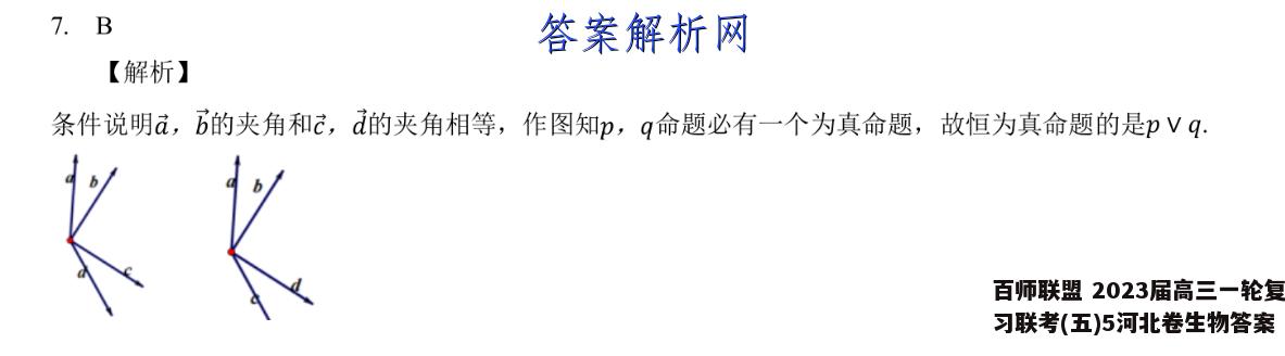 7.B【解析】条件说明a,b的夹角和c,d的夹角相等,作图知p,q命题必有一个为真命题,故恒为真命题的是pVq.
