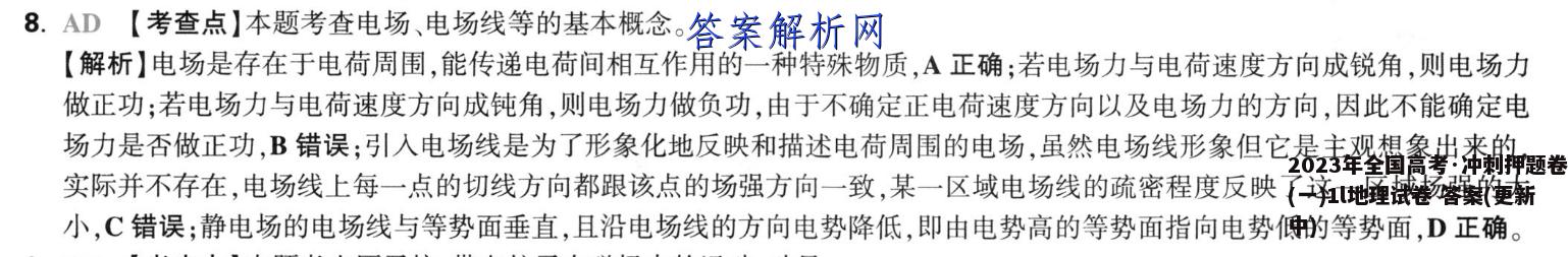 8.AD【考查点】本题考查电场、电场线等的基本概念。【解析】电场是存在于电荷周围,能传递电荷间相互作用的一种特殊物质,A正确:若电场力与电荷速度方向成锐角,则电场力做正功;若电场力与电荷速度方向成钝角,则电场力做负功,由于不确定正电荷速度方向以及电场力的方向,因此不能确定电场力是否做正功,B错误:引人电场线是为了形象化地反映和描述电荷周围的电场,虽然电场线形象但它是主观想象出来的,实际并不存在,电场线上每一点的切线方向都跟该点的场强方向一致,某一区域电场线的疏密程度反映了这一区域场强的大小,C错误;静电场的电场线与等势面垂直,且沿电场线的方向电势降低,即由电势高的等势面指向电势低的等势面,D正确。