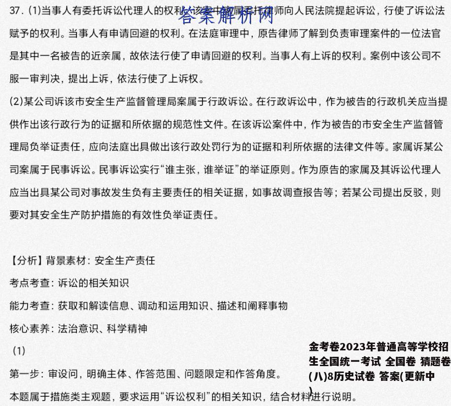 37.(1)当事人有委托诉讼代理人的权利。该案中家属委托律师向人民法院提起诉讼,行使了诉讼法赋予的权利。当事人有申请回避的权利。在法庭审理中,原告律师了解到负责审理案件的一位法官是其中一名被告的近亲属,故依法行使了申请回避的权利。当事人有上诉的权利。案例中该公司不服一审判决,提出上诉,依法行使了上诉权。(2)某公司诉该市安全生产监督管理局案属于行政诉讼。在行政诉讼中,作为被告的行政机关应当提供作出该行政行为的证据和所依据的规范性文件。在该诉讼案件中,作为被告的市安全生产监督管理局负举证责任,应向法庭出具做出该行政处罚行为的证据和利所依据的法律文件等。家属诉某公司案属于民事诉讼。民事诉讼实行“谁主张,谁举证”的举证原则。作为原告的家属及其诉讼代理人应当出具某公司对事故发生负有主要责任的相关证据,如事故调查报告等;若某公司提出反驳,则要对其安全生产防护措施的有效性负举证责任。【分析】背景素材:安全生产责任考点考查:诉讼的相关知识能力考查:获取和解读信息、调动和运用知识、描述和阐释事物核心素养:法治意识、科学精神(1)第一步:审设问,明确主体、作答范围、问题限定和作答角度。本题属于措施类主观题,要求运用“诉讼权利”的相关知识,结合材料进行说明。第二步:审材料,通过标点符号、段落等,提取材料有效信息。依据《民事诉讼法》的规定,民事诉讼当事人享有委托诉讼代理人、申请回避、上诉的权利。有效信息①:事故死者的家属已委托律师向人民法院提起诉讼→当事人有委托诉讼代理人的权利。有效信息②:在法庭审理中,原告律师了解到负责审理案件的一位法官是其中一名被告的近亲属,因此向法庭提出该法官回避的申请→当事人有申请回避的权利。有效信息③:案件经过该区人民法院审理,认定该市安全生产监督管理局处罚决定合理合法,驳回原告诉讼请求。该公司不服,提出上诉→当事人有上诉的权利。第三步:整合信息,组织答案。组织答案时应符合一定的逻辑,层次感、段落化,并且注重使用学科术语。(2)第一步:审设问,明确主体、作答范围、问题限定和作答角度。题目要求结合材料说明在举证责任上二者有何区别,因此首先要明确材料中涉及哪几种诉讼类型,然后结合材料进行分析。第二步:审材料,通过标点符号、段落等,提取材料有效信息。有效信息①:该公司对该行政处罚决定不服,向人民法院提起诉讼一→行政诉讼有效信息②:事故死者的家属已委托律师向人民法院提起诉讼,请求判决某公司等三被告共同赔偿其损失共计120余万元→民事诉讼第三步:整合信息,组织答案。组织答案时应符合一定的逻辑,层次感、段落化,并且注重使用学科术语。